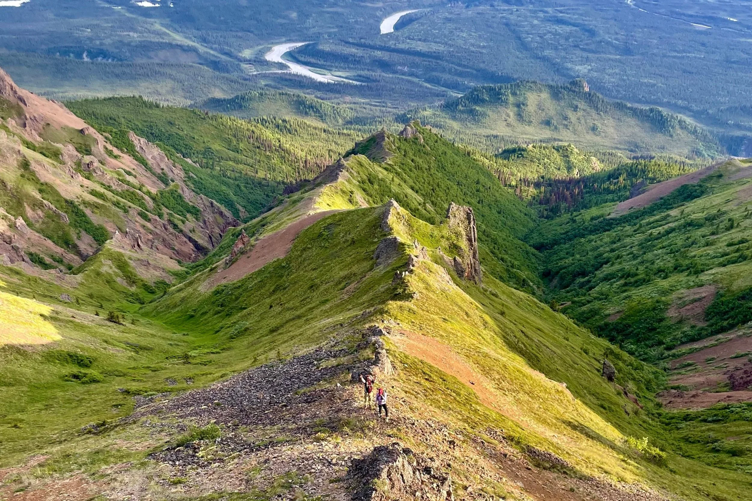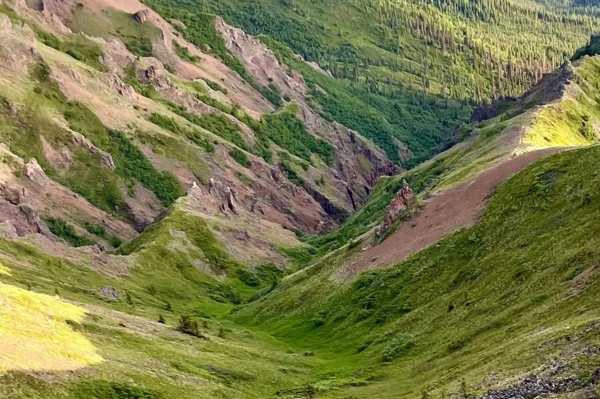 There is an excellent example of a Dall sheep trail in the bottom left corner of this photo. As with many sheep trails, this one follows the ridge.
